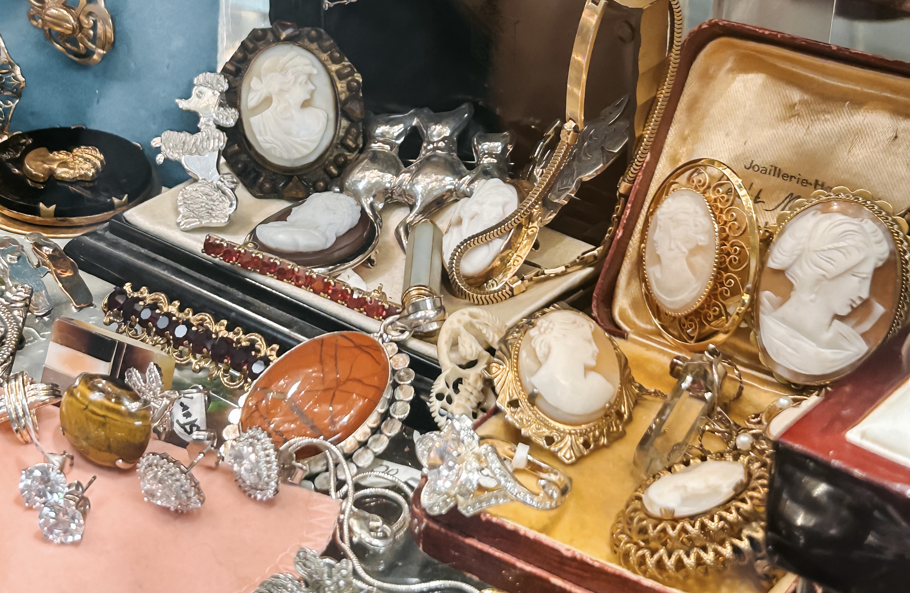 Among the many treasures that Vintage Vogue holds, Teresa's favorite era is the Victorian era. Within this period, she finds herself drawn to one particular gem – the cameo. For those unfamiliar, a cameo is a miniature carving done on stone that depicts a profiled figure against a contrasting background. These pieces were commonly worn on velvet chokers and became a staple look in the 20th century. Teresa's collection includes stunning cameos sourced from around the world – Italy, England, France, and more.